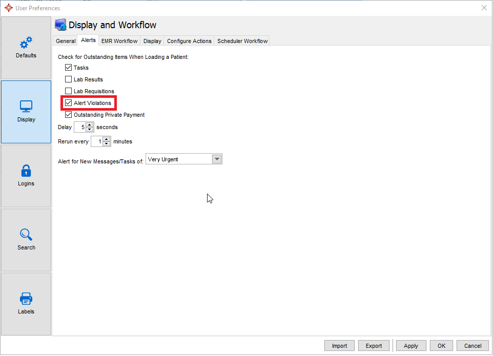 To ensure Query Alerts display in your patient status bar: Accuro Menu > File > User Preferences > Display > Alerts > Check: Alert Violations > <Apply> > <OK>