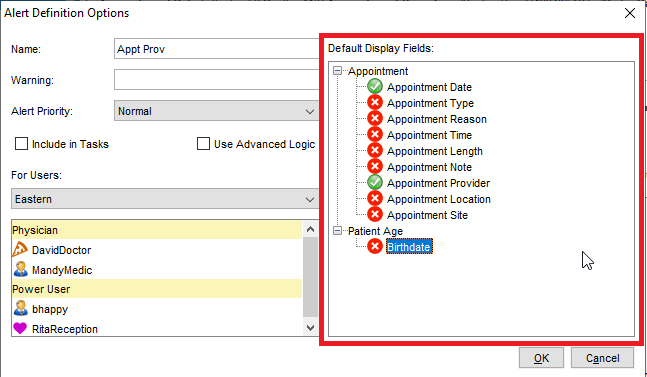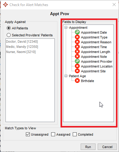 • Otherwise, ad hoc, when clicking the <Run Report> button, you can specify "Fields to Display" in the "Check for Alert Matches" window, the same as above, by double-clicking as appropriate to display or hide the available options.