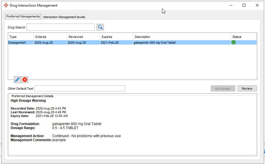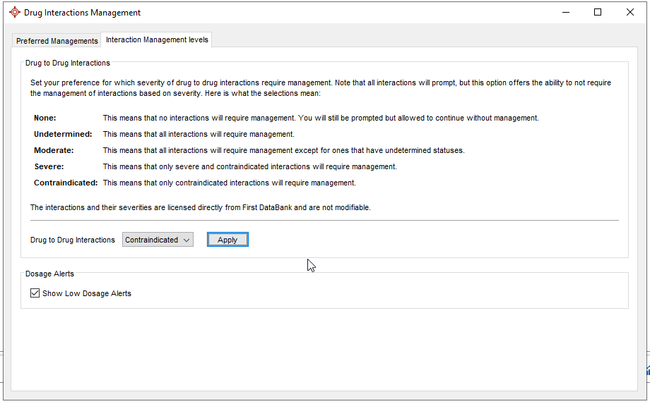 Additionally, for Drug to Drug interactions, you can set a preference for which severity of interactions require management. They will still display for you, but management will not be required.