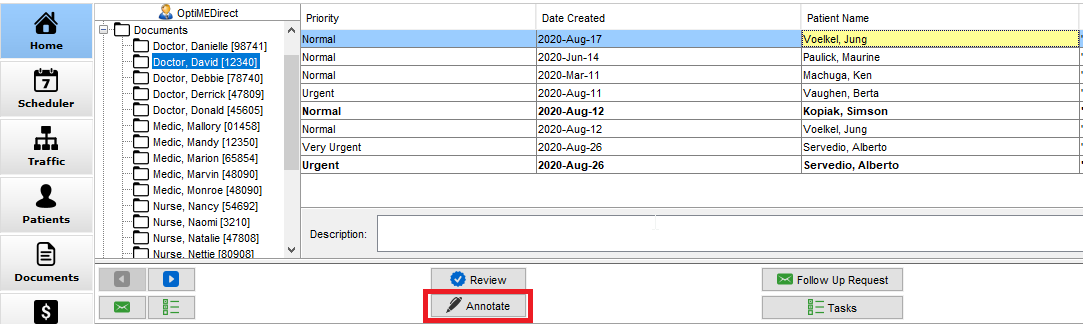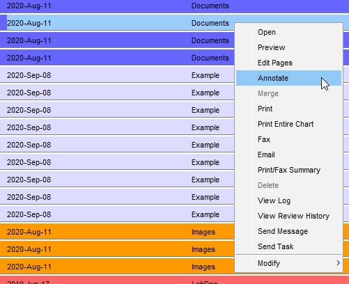 When in the Document section, there is the <Annotate Document> button on the far right, under the Send to Provider, Clear, and Open buttons. This allows you to highlight, add text, and add signatures to Documents ad hoc. This functionality is also available on the Virtual Chart, and in the Document inbox for providers when they are reviewing documents.
