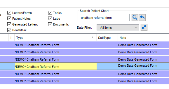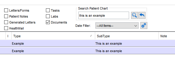 I am not sure in which build version this changed, but this has been rectified since this submission; the Virtual Chart can be searched through the search field by both document Type and Sub-Type.