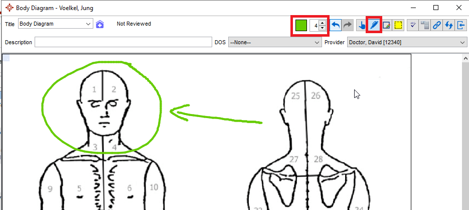 Providers do have the ability to use the draw tools on a form. With a form open on a chart in the EMR > Encounter Notes section, click on the pen icon in the upper left toolbar. The thickness and colour can also be customized.