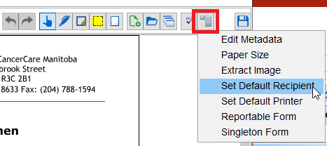 Accuro Menu > Tools > Form Editor > Load Form > Advanced (icon that looks like a stack of paper) > Set Default Recipient. Once clicked the Address Book will launch and you can choose which contact you would like the form to be faxed to by default.