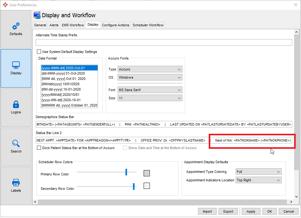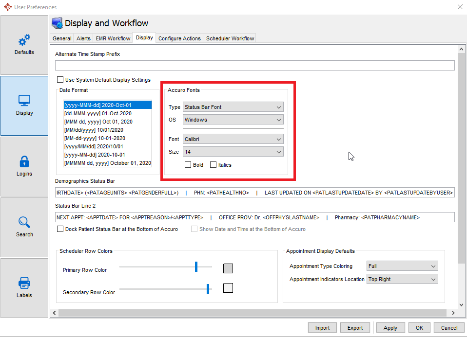 Accuro Menu > File > User Preferences > Display > Display