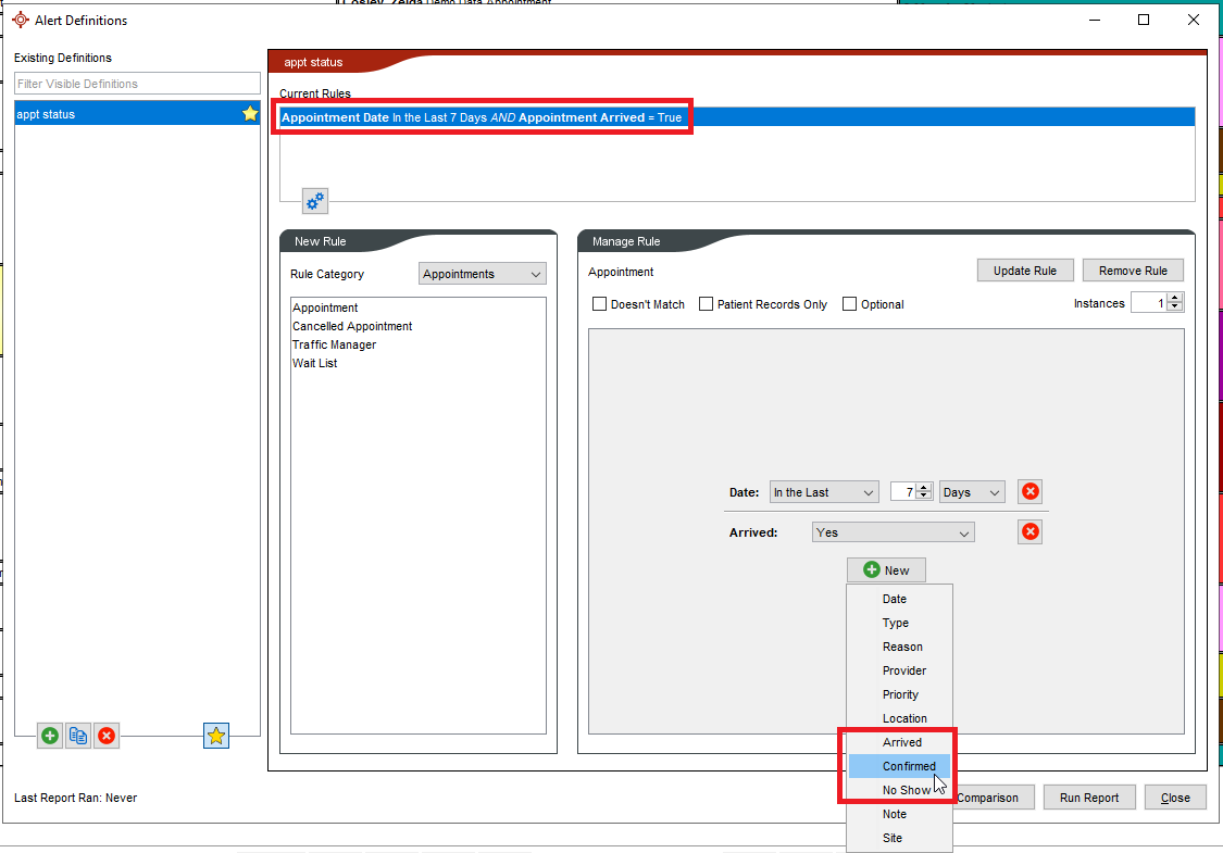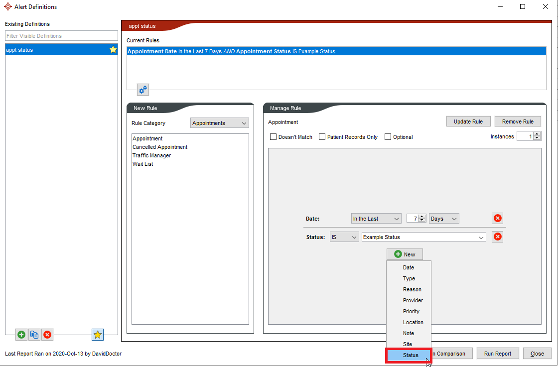 • Under the Appointments Rule Category, when selecting the Appointment option, then <New>, Status will now be a menu option