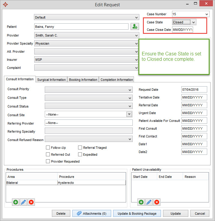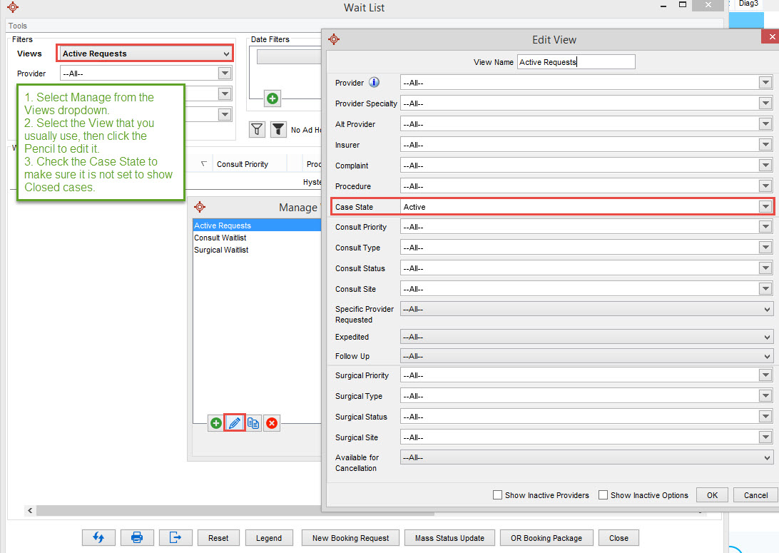 All of my requests (Active, Consult, Surgery) are set to active. Closed is NOT checked. However, once a case is closed, it is still showing in the F4 list.