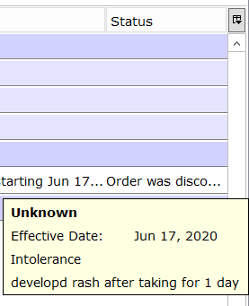 Although you can't see the reason typed into a discontinued prescription right from the Status column in the Medications tab, if you hover your mouse over the status, you can see the reason for discontinuation quickly in the tooltip.