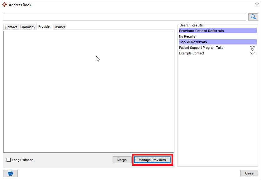 While specialty cannot be searched for directly within the Address Book, if you click the <Manage Providers> button in the provider tab, you will be taken to a separate provider search window. There is an Advanced Search section here that will allow you to search by specialty.