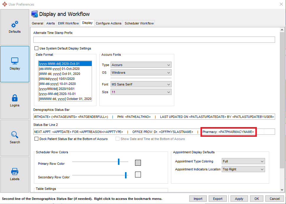 Accuro Menu > File > User Preferences > Display > Display. If you right-click in the Status Bar Line fields, you can choose Default Pharmacy information tags from the Patient menu. Click <Apply> then <OK> to save and update your display.