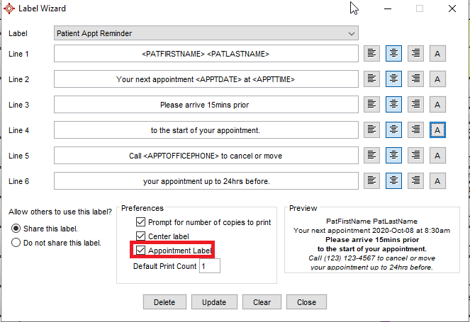 While you cannot customize the existing Appointment Reminder Label, you can create your own custom options.