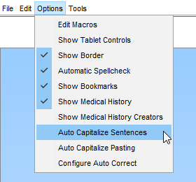 EMR > Encounter Notes > Load Patient > Select a clinical note templates > Options (upper left corner) > Select "Auto Capitalize Sentences"