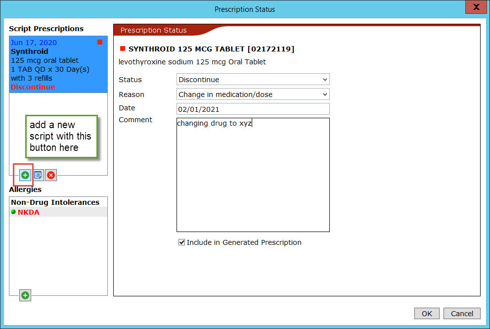 Then in the Prescription Status window, you can choose to include the discontinue notice on a Generated Prescription, and even add a new drug to the prescription to either Print or Fax back to the pharmacy.